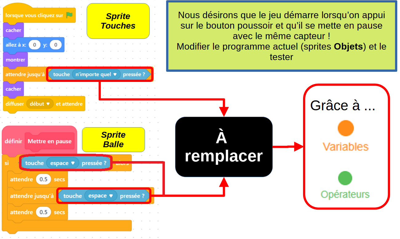 - En testant le jeu, sur [partie 3 - Fiche élève], représenter graphiquement le fonctionnement du bouton poussoir et compléter les bandeaux liées aux informations et signaux.