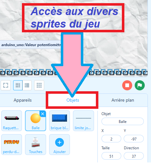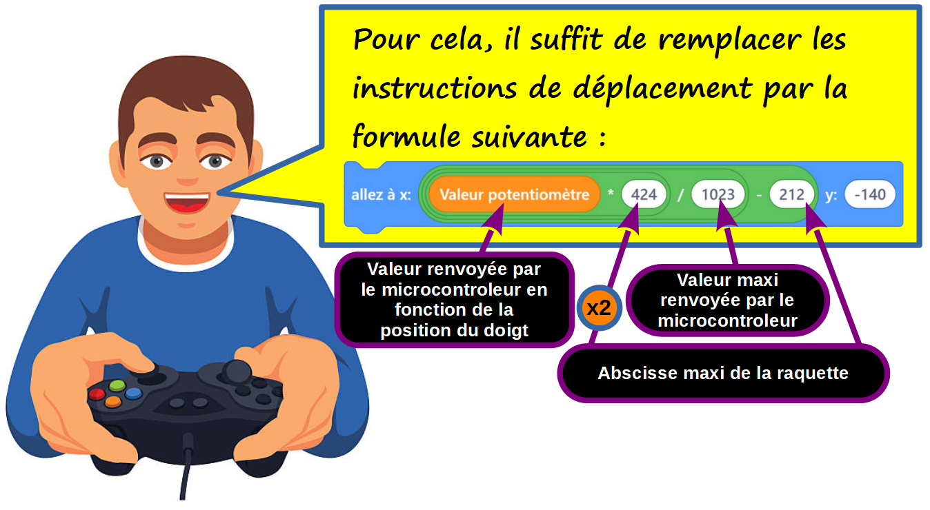 - Compléter le tableau [partie 7 - Fiche élève] afin de savoir où noter la formule permettant de diriger la raquette avec le potentiomètre :