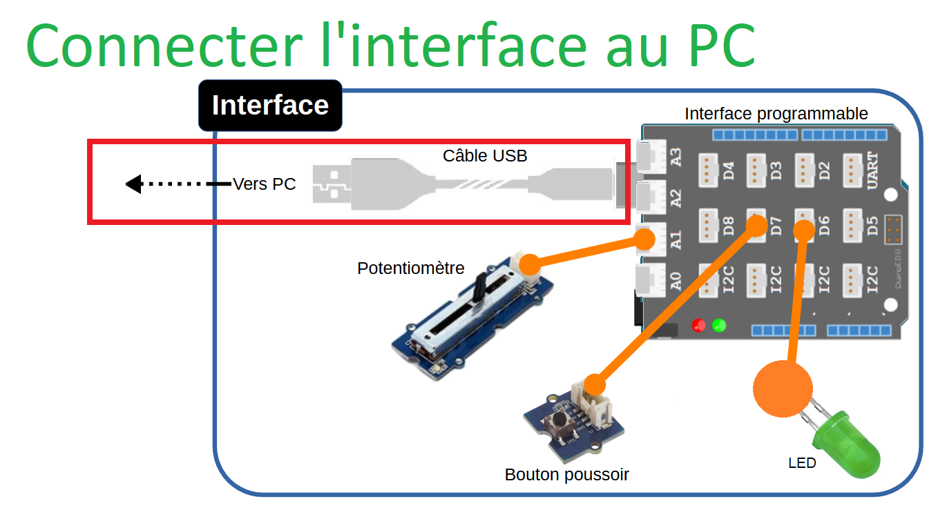 - Connecter l'interface à l'ordinateur et tester le potentiomètre et bouton poussoir (en observant la valeur des variables créées, sur l'écran) :
