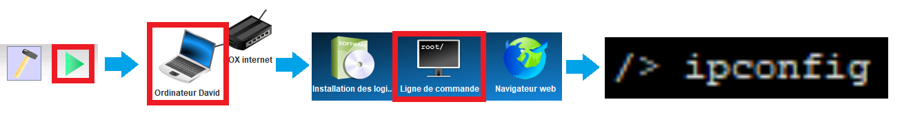- Ce fichier représentant une simulation de ce qu'est internet : en mode simulation, allumer l'ordinateur de David et déterminer son adresse ip en tapant (et validant) la commande "ipconfig" sur l'application "ligne de commande". Noter cette adresse ip dans [Partie 4 - fiche élève] :