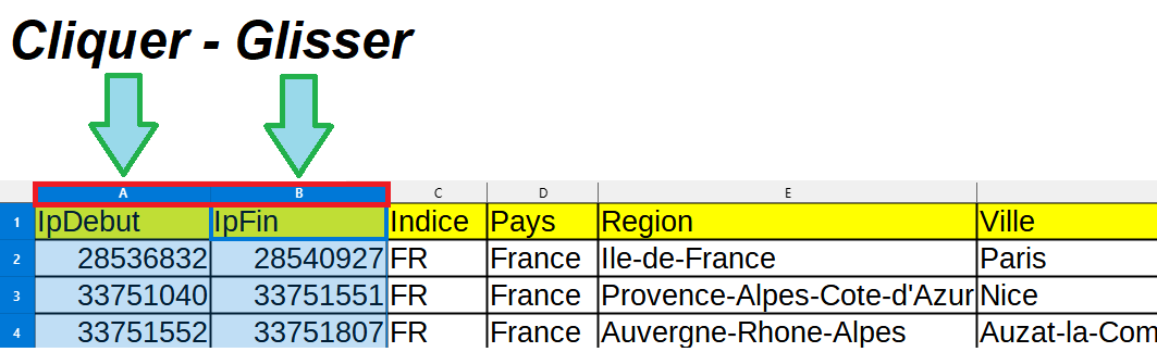 - Sélectionner le contenu des colonnes A et B en cliquant-glissant sur les lettres A et B :