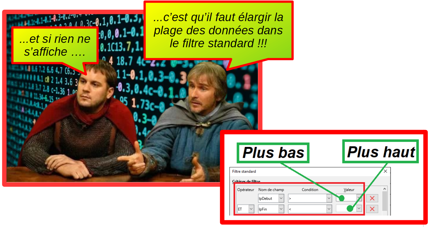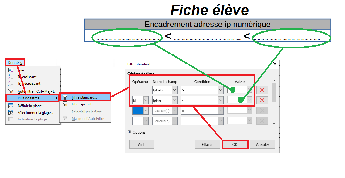 - Afin de trouver facilement l'adresse IP parmi les milliers de lignes du tableur, utiliser le filtres standard avec les valeurs d'encadrement de l'adresse ip numérique (voir fiche élève) :