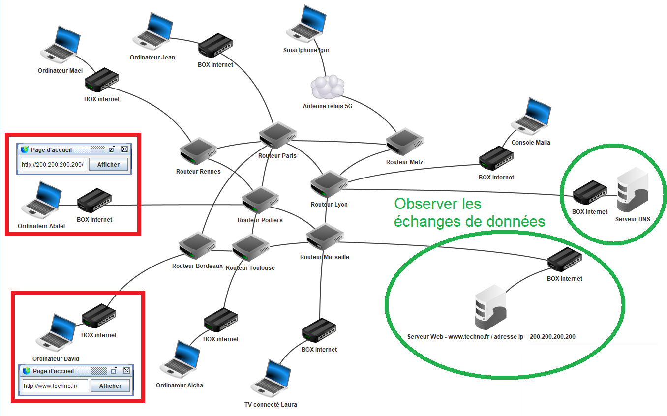 - Télécharger et ouvrir le fichier Filius "internet c quoi.fls"