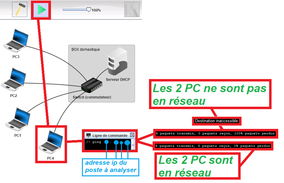 - En mode Simulation, vérifier si chaque PC communique entre eux grâce à la commande ping :