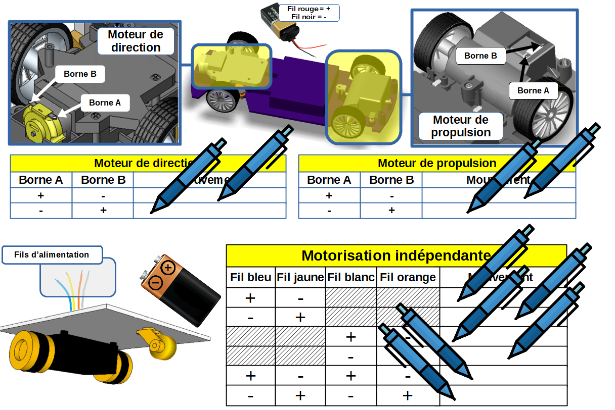 - Pour chaque maquette distribuée et à l'aide des piles, déterminer les divers mouvements de chacune d'elle en complétant [partie 2 - fiche élève] et [partie 3 - fiche élève] :