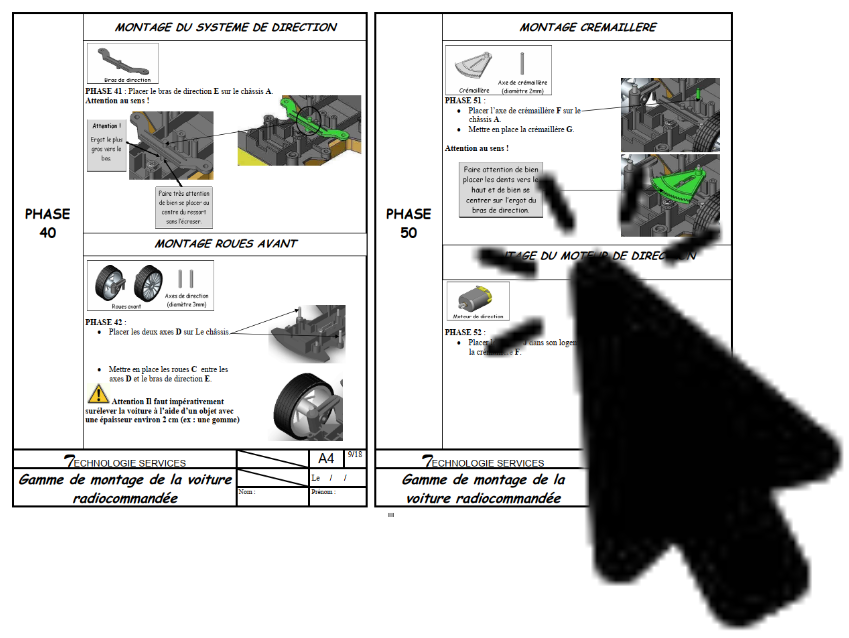- à partir des pièces détachées distribuées, faire le montage de la direction à crémaillère jusqu'à la phase 52 :
