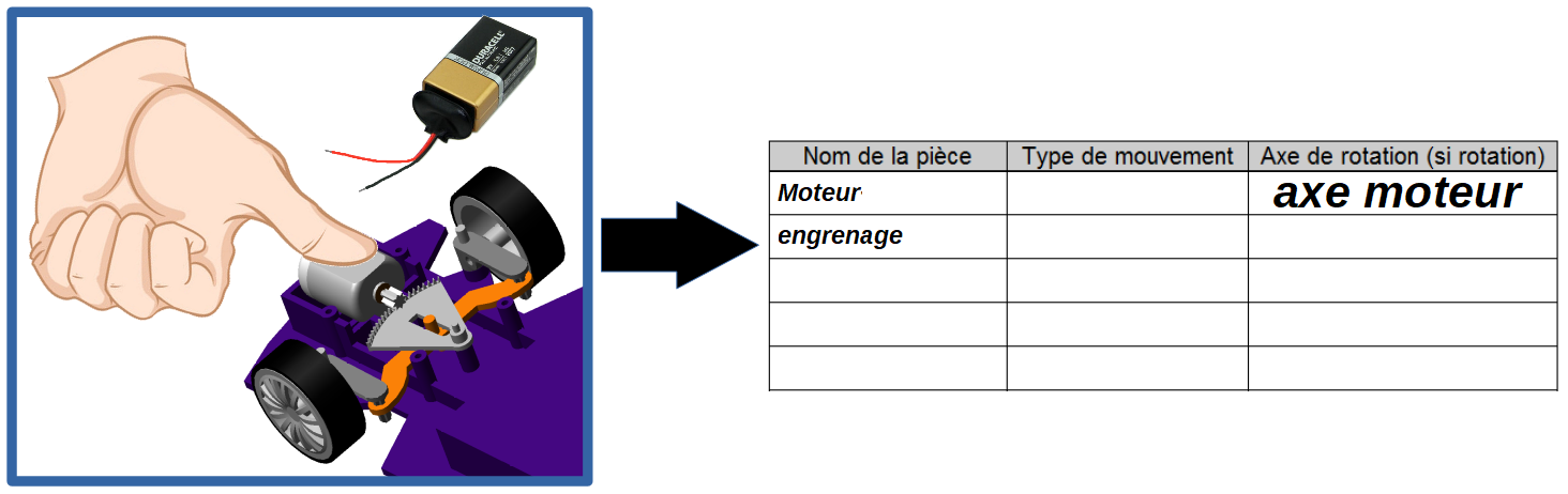 - En appuyant sur le moteur, déterminer (en manipulant) quelles sont les pièces en mouvement et compléter le tableau [partie 4 - fiche élève] :