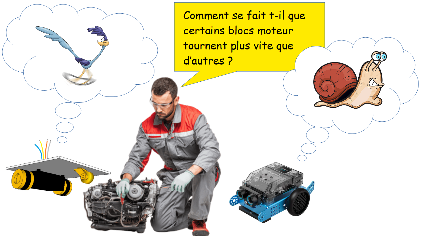 - Calculer la vitesse de rotation des roues du bloc moteur (à partir du rapport de réduction) et conclure en complétant le texte à trous [partie 5 - fiche élève] :