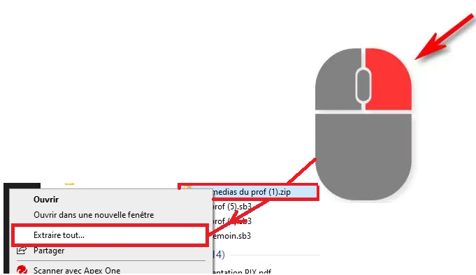 - Dézipper (bouton droit de la souris) le dossier afin d'obtenir un dossier "normal" (procédure ci-dessous) :