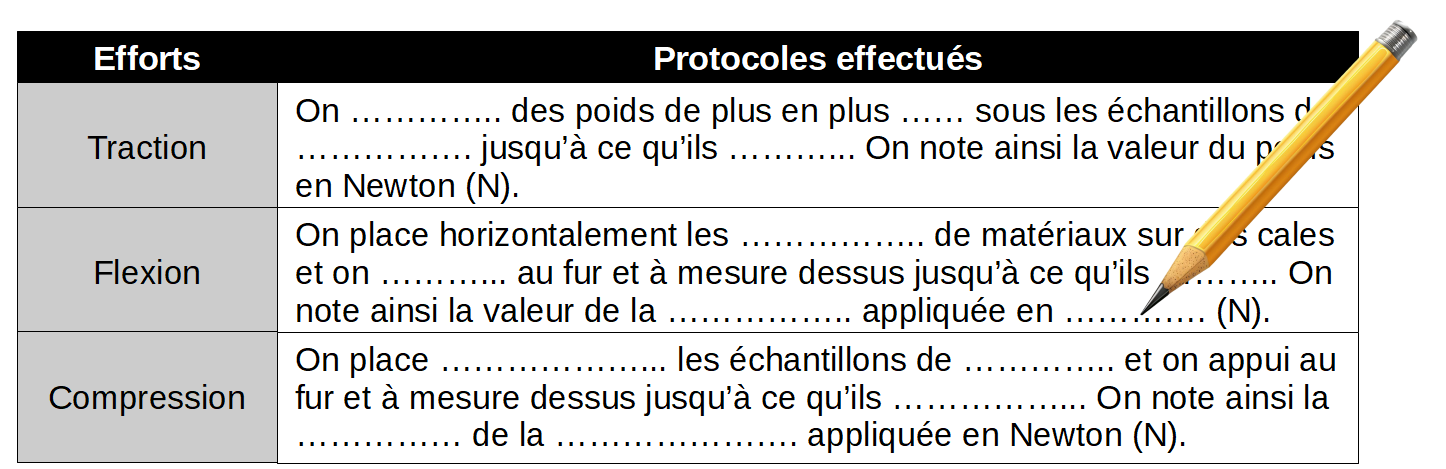 - En naviguant sur ce site (et en testant la résistance des matériaux), compléter le tableau [Partie 3 - fiche élève] :