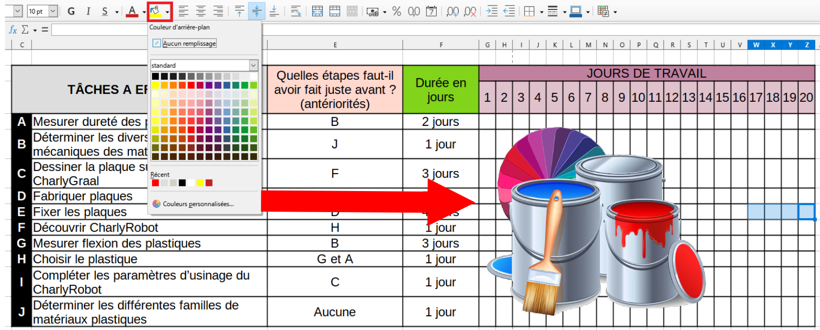 - Ouvrir le fichier "Planning eleve" et le compléter en coloriant les cellules du descripteur : jours de travail