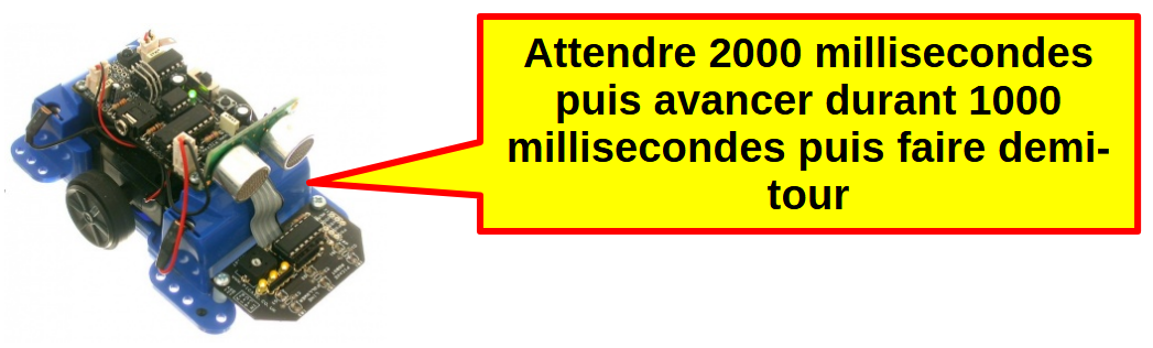 Attendre 2000 millisecondes puis avancer durant 1000 millisecondes puis faire demi-tour :