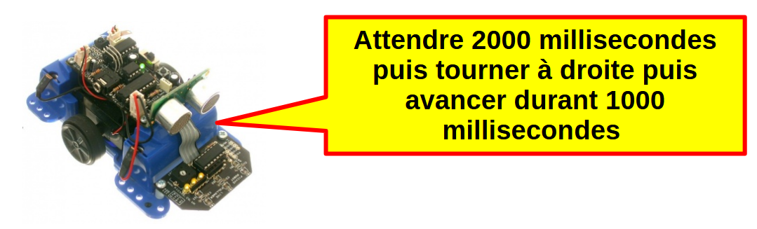 Attendre 2000 millisecondes puis tourner à droite puis avancer durant 1000 millisecondes :