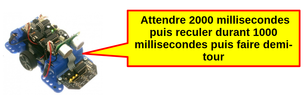 Attendre 2000 millisecondes puis reculer durant 1000 millisecondes puis faire demi-tour :